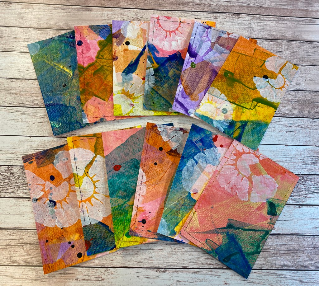 Now for the background I started with a large sheet of watercolor paper and did use fluid acrylic paints, first in warm colors like reds, then after drying the paint I added the blue and green cooler colors. I also used one of my stencils (you can find them here ) with some gesso. I also used my sewing machines on half of the cards. Enjoy the video!