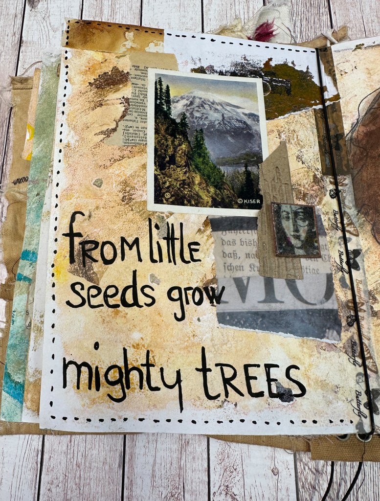 Thank you for stoping by. In this video I’m working again in Lena’s Journal. For those who don’t know, we did exchange journals last year and so we work in each others journal. For this time I decided to use up some small scraps I have in my pile and made a collage.