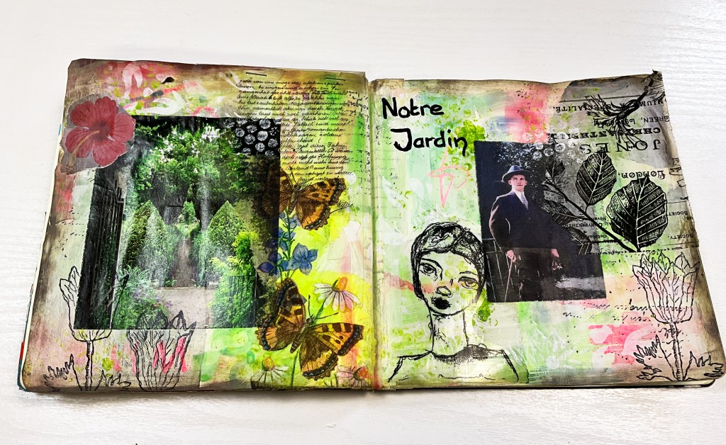 Now the quote I have from the magazine page where I ripped out that garden scene. It was in a magazine called “Mon Jardin” I just changed to “Notre Jardin” cause I can 😉. I did use a black Posca Pen, or better two I started with the fine one and then went over with a broader one.