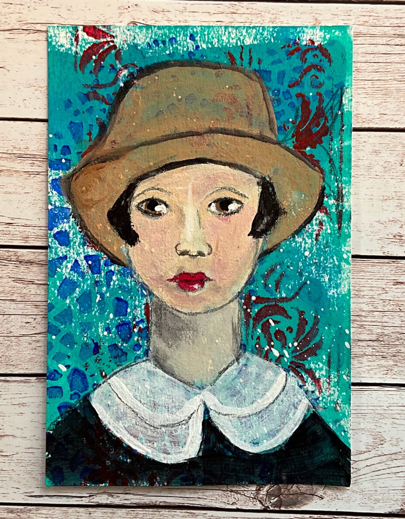 For this month’s #3girlsand12faces collaboration, I had the pleasure of working on a background created by my friend Marie Linder. Inspired by the intricate and expressive works of Australian Painter Margaret Preston, I set out to bring a unique face to life on this canvas.