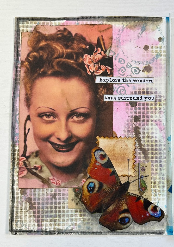 The background was built using Distress Ink and a stencil, adding texture and depth to the piece. The quote I chose for the page is “Explore the wonders that surround you,” which really ties into the theme of discovery and creativity.
