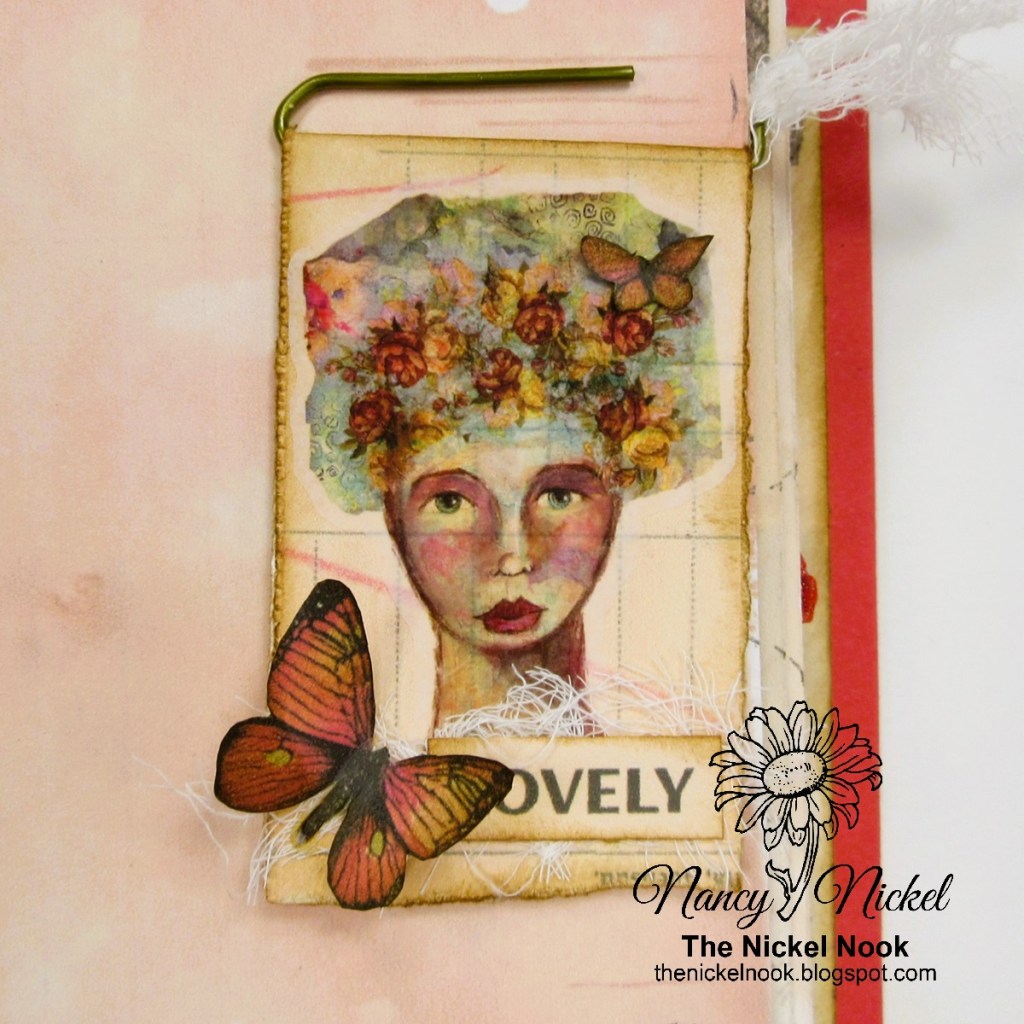 This month, Nancy has continued to work on her inspiring junk journal, which she has now titled FACES. She brings her love for stenciling and stamping to life. She starts with the title page, where she spells out “faces.” She adds her signature touch by layering a stenciled face alongside a collection of stamped faces. This creates a dynamic and textured entry that perfectly sets the tone for the rest of the journal.