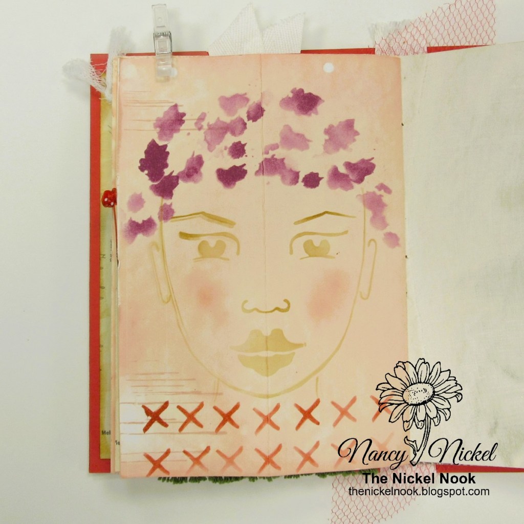 Nancy used the Pretty Face stencil which you can find here as the main focus. She added more depth with the Mark Making Stencil on another page. The mix of elements gives her journal an expressive and artistic look that highlights her unique style.
