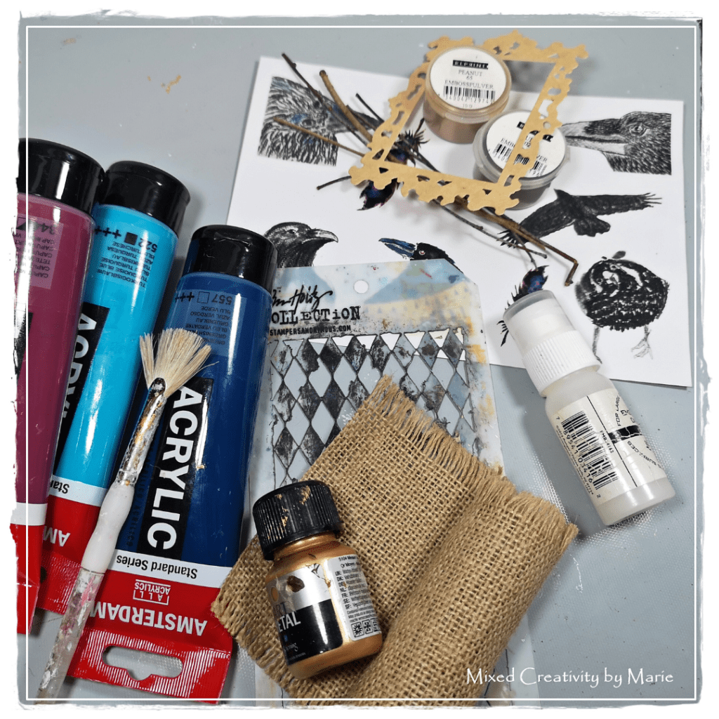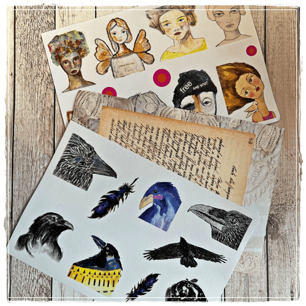 Every morning, Marie sets out on a quiet walk when the world is still waking up. Accompanied by the early calls of crows, she finds inspiration in nature and simple, forgotten treasures around her. This week, Marie crafted a Mixed Media Tag. It is titled The Crow and features the latest addition, the A5 Washi Sticker Sheet “Faces, Crows, and More.”