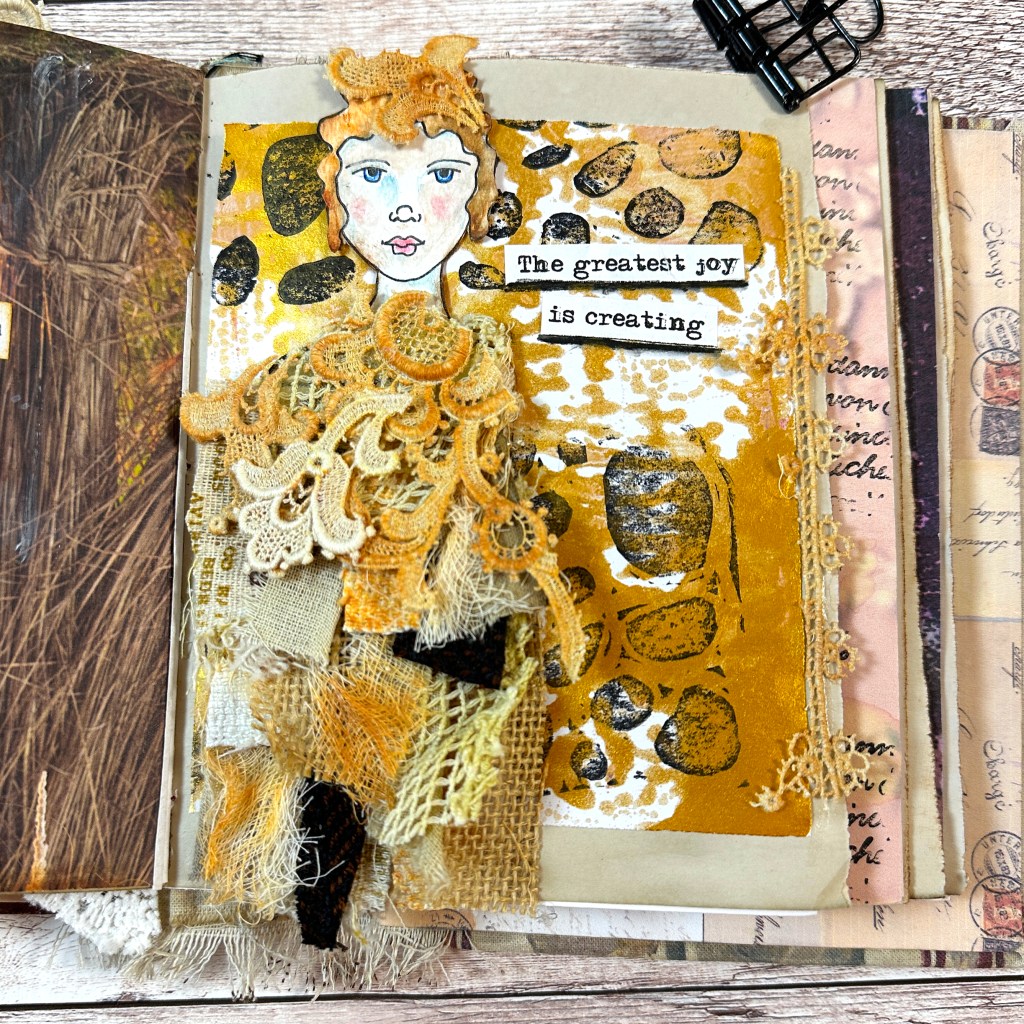 In my latest journal entry I dress up a doll. I combine my Pretty Faces stamp set with a collection of fabric scraps. This creates a unique mixed media piece. I start with a stamped and watercolored girl. Then, I use a heat gun to craft a textured dress from bits of lace and fabric.