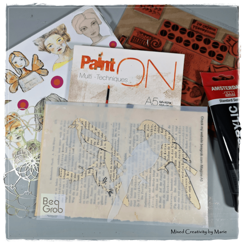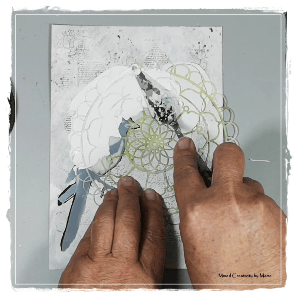 Marie began her project with my A5 stencil “Magpie”. She used it in two versatile ways: as both a stencil and a template. The result? A striking and layered design that highlights the stencil’s adaptability. She shares, “I love the stencil and the template; they are so versatile.”
