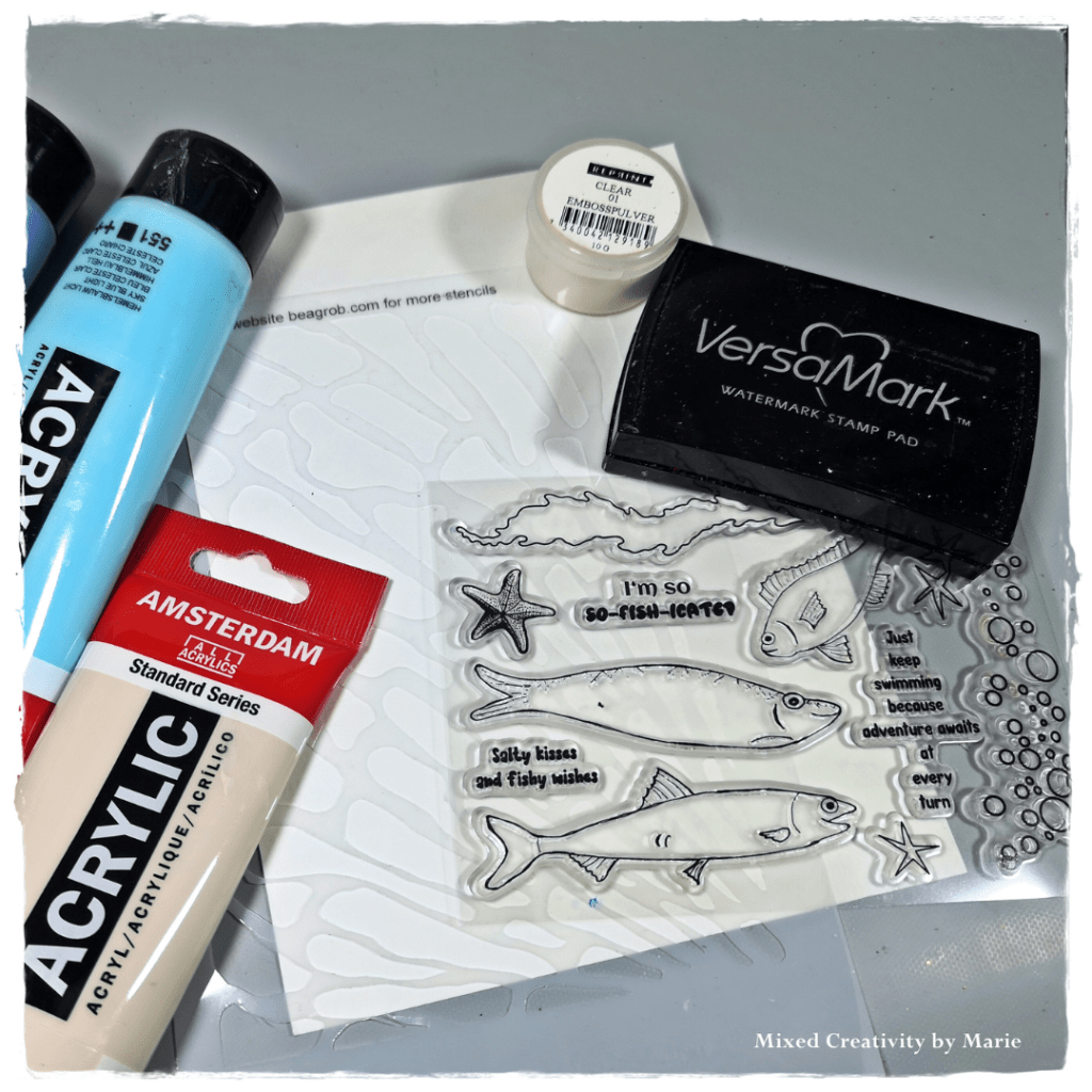 Dive into the magical underwater world with this stunning art journal page by Marie! 🐟 Using the Fish Stamp Set from Bea Grob Mixed Media and More, she brought an aquatic scene to life. The set includes beautiful fish, sea grass, and whimsical text that perfectly capture the underwater vibe.
