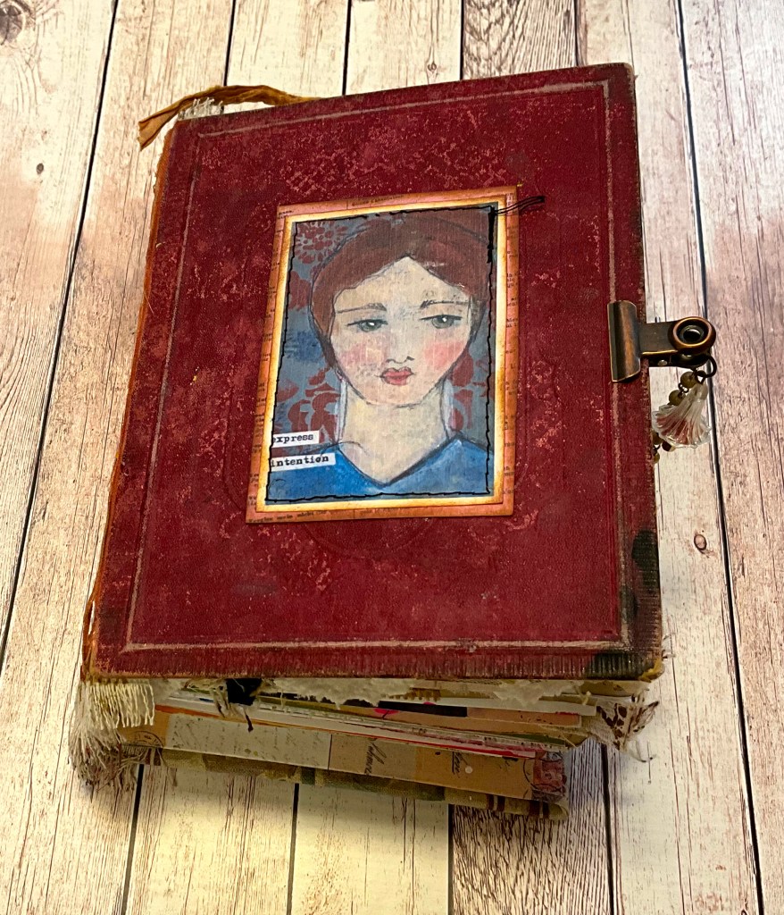 The pages inside are filled with my collage papers. They are mixed with coffee-dyed printer paper and some treasured pieces from my stash. There are also lots of paint, inks, and mixed media goodness. It’s roughly A5-sized, making it the perfect size for an expressive, layered journal.
