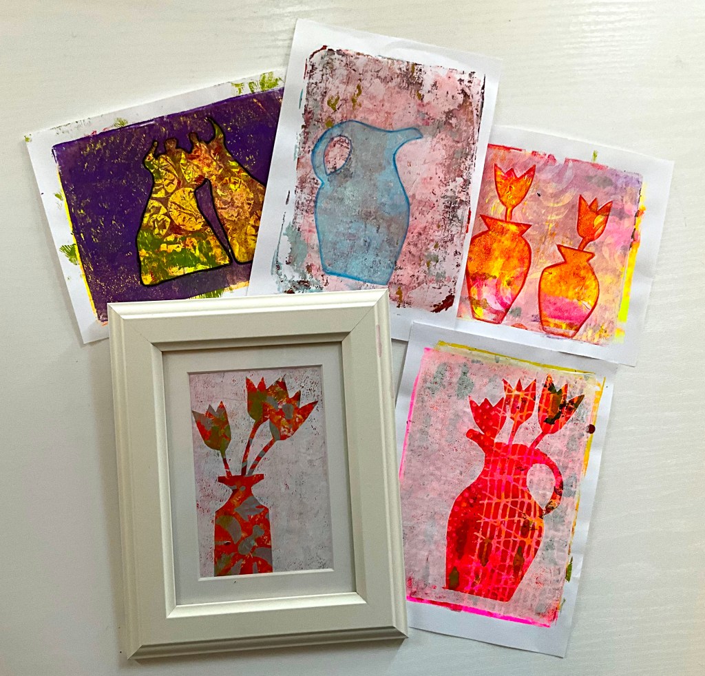 Gelli printing is one of my favorite ways to experiment with color, texture, and layers. In this session, I dedicated an entire afternoon to playing with found objects. I used acrylic paint and masks. I created prints with multiple pulls and stunning textures.