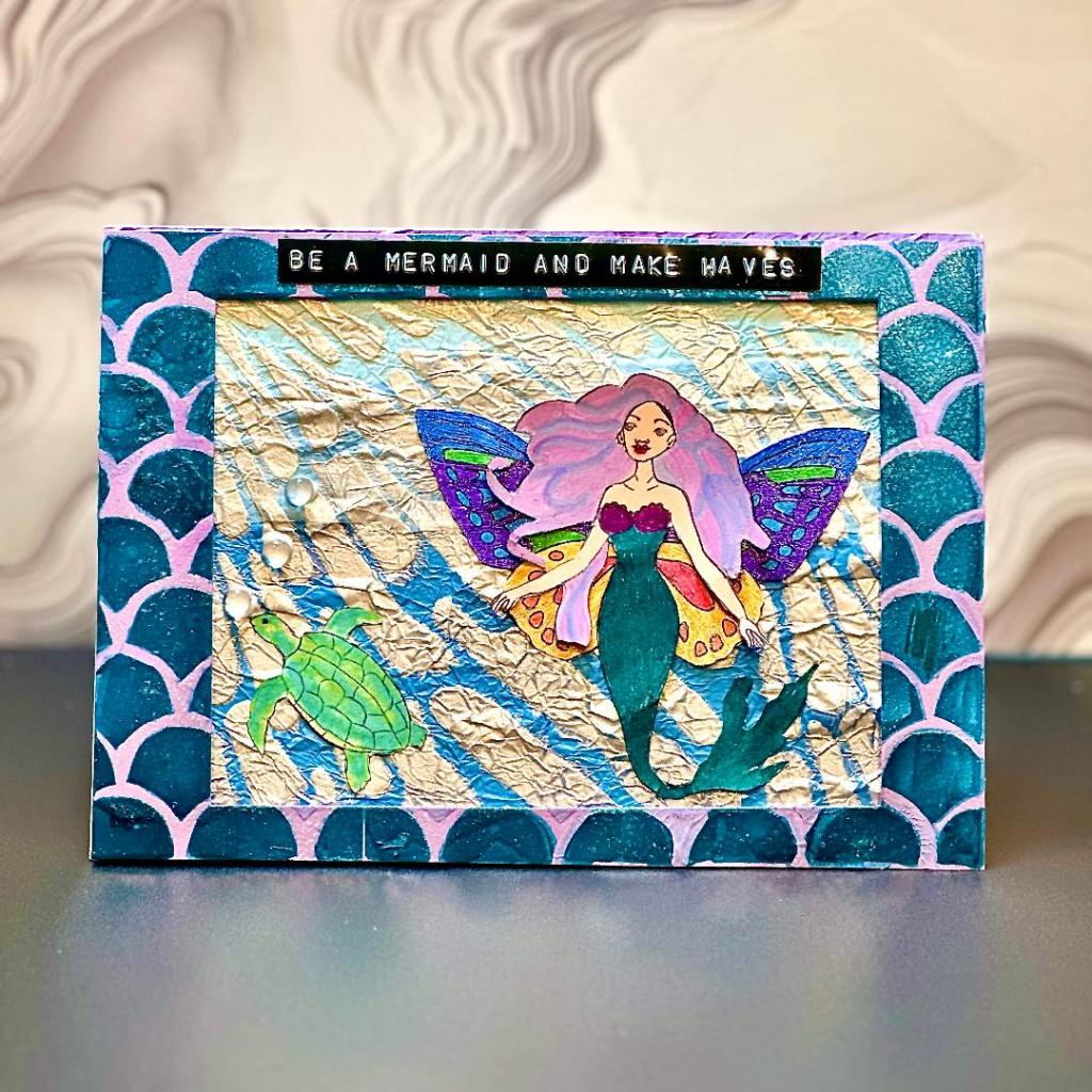 At the heart of the scene, a graceful mermaid fairy glides through the ocean alongside a friendly turtle. Together, they bask in the golden rays. They embody the card’s gentle reminder to “make waves.” This sentiment is perfectly echoed by the visual motion in the tissue paper background.