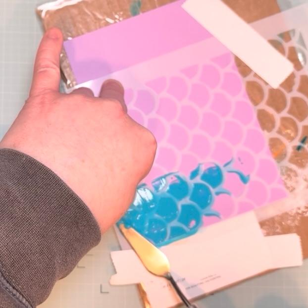 Walter used the Mermaid Fairy digital collage papers. Along with the Coral and Distressed Scales stencils, he created a layered seascape. This artwork captures the light and movement of the deep blue sea.