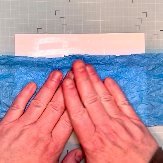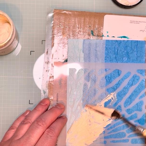 The background begins with two shades of blue tissue paper, carefully arranged to create soft wrinkles that mimic underwater currents. A touch of Iridescent Gold Polishing Plaster adds a radiant glow. It resembles sunlight dancing through the water’s surface and sinking into the depths below.