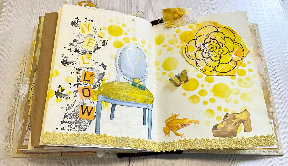 Art journal page with quirky collage people, stencil background in blue, green, and orange
