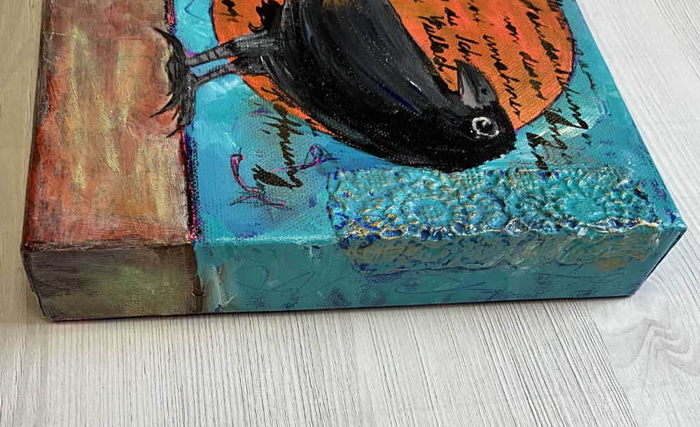This 20 x 20 cm mixed media painting was created on a deep canvas —I prefer deep canvases to work on.