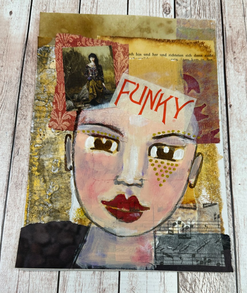 Ich habe mit einigen Ephemera angefangen, wie z. B. Resten von Scrapbook-Papier, alten Buchseiten, handelsüblichem Seidenpapier, Gel-Drucken, aber auch einem Bild aus einer Zeitschrift. Natürlich habe ich auch etwas Farbe verwendet. Und nun viel Spaß mit dem Video.