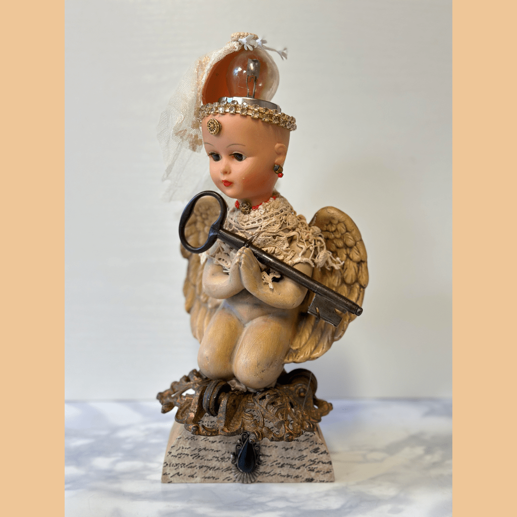 Ich werkle gerade wieder an einer Assemblage. Es war ein Auftrag für jemanden, der den Körper eines Keramik-Engels hatte und wollte, dass ich ihn in etwas verwandle, das ihr gefällt. Ich habe einen Teil des Prozesses gefilmt und werde demnächst ein Video machen, um einen Einblick zu geben, wie ich bei solchen Assemblagen vorgehe. Ich habe keine klare Vorstellung, wenn ich anfange, ich muss Dinge ausprobieren und manche verwerfen, und manche funktionieren besser, als ich erwartet habe.
