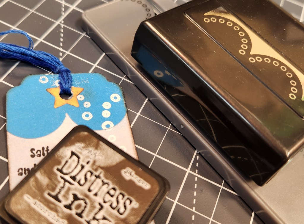 Jamie begann mit dem Collage Papier und einem Reststück, das sie mit einem Bordürenstanzer bearbeitet hat. Sie klebte die Bordüre an den oberen Rand des Lesezeichen-Tags. Sie rundete die Ecken oben dekorativ ab. Unten rundete sie die Ecken leicht ab. Dann färbte sie die Ränder mit Distress Ink in Scorched Timber für einen Vintage-Look ein.