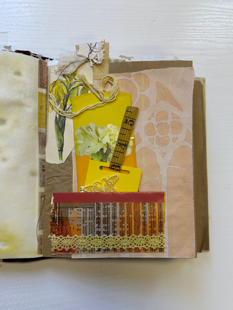 I’ll provide a detailed list once you join, but you probably already have many materials at home — mixed media paper, musicsheets a bit of fabric, lace scraps, and turmeric powder for the dye bath.